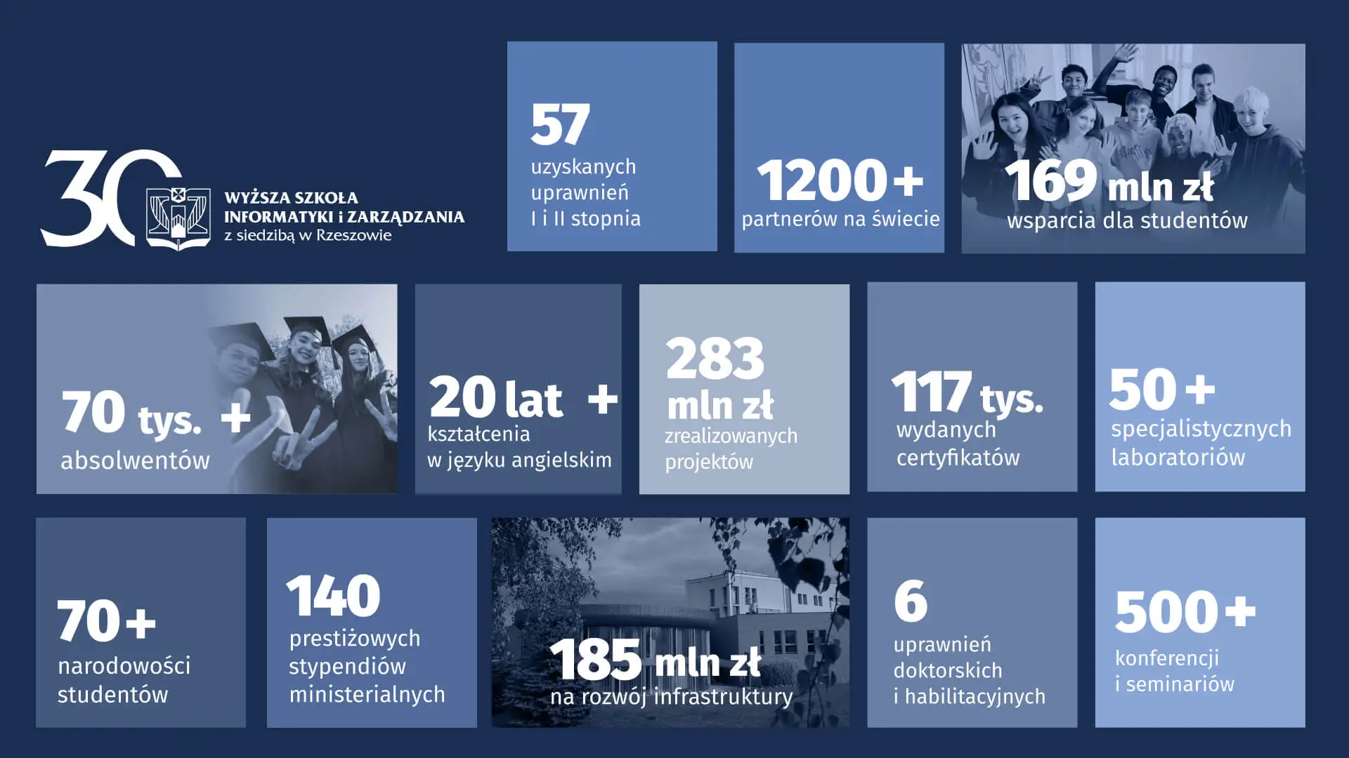 Університет Інформаційних технологій та Менеджменту в Жешуві. сьогодні відзначає своє 30-річчя. Такий ювілей — це виняткова нагода озирнутися назад і підсумувати досягнення до цього часу. Це також особлива можливість свідомо й сміливо окреслити плани на майбутнє. УІТМ не знижує темпу та сміливо зустрічає нові виклики і зміни.