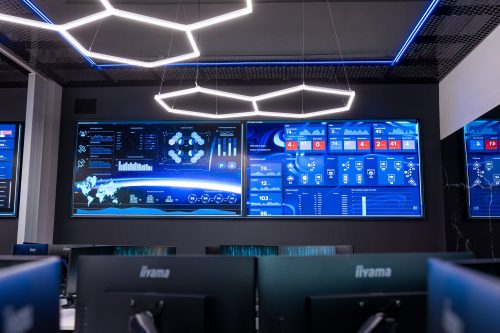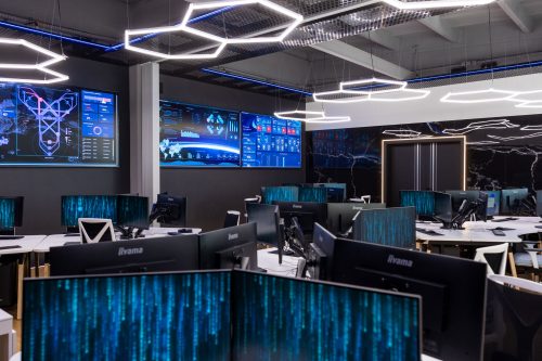 Лабораторія має 24 повністю оснащені робочі місця для студентів (молодших аналітиків SOC). Додатково вона обладнана потужною Video Wall, що складається з 4 екранів діагоналлю 115 дюймів кожен, що створює ефект перебування в центрі керування космічними пристроями. Чому це важливо? Це не декорація. Це серце SOC, на якому відображається Common Operational Picture — карта кіберзагроз у реальному часі, видима для всієї команди. Такого немає в жодному іншому університеті Польщі.