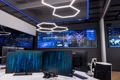 Лабораторія має 24 повністю оснащені робочі місця для студентів (молодших аналітиків SOC). Додатково вона обладнана потужною Video Wall, що складається з 4 екранів діагоналлю 115 дюймів кожен, що створює ефект перебування в центрі керування космічними пристроями. Чому це важливо? Це не декорація. Це серце SOC, на якому відображається Common Operational Picture — карта кіберзагроз у реальному часі, видима для всієї команди. Такого немає в жодному іншому університеті Польщі.