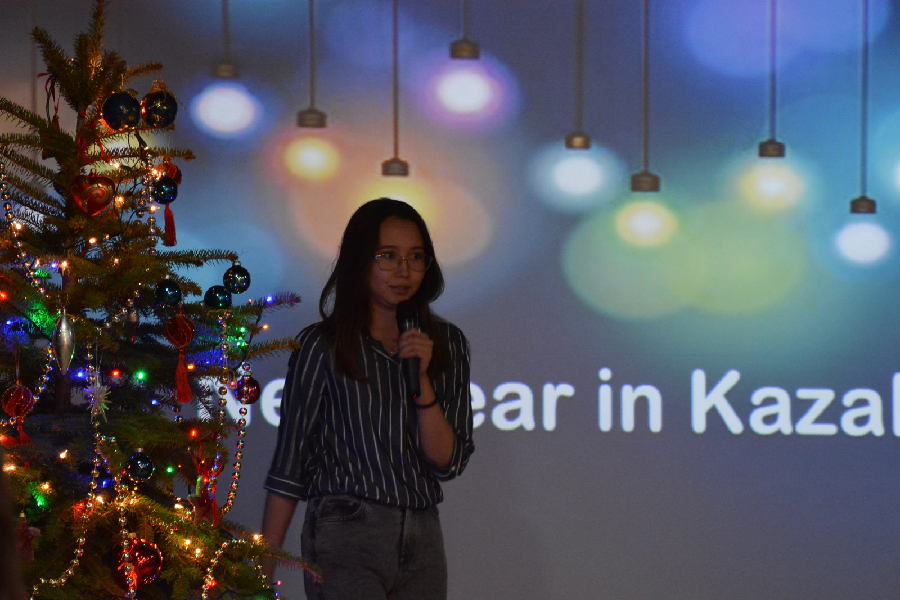 Тоді слово взяла студентка з Казахстану Діана Сабітова. Як виявляється, це свято не відзначається в її країні, але під впливом західної культури посилюється роль Нового року як найважливішого дня зими. Головним героєм свята є Дідусь Морз, а найбільша ялинка у місті чи селі стає основним місцем веселощів та забав. Після того як вся сім’я збереться за святковим столом із традиційними стравами, члени родини обмінюються подарунками, переглядають різдвяні програми та фільми по телебаченню. О півночі кожен канал показує найважливішу „програму” – новорічну промову президента Казахстану, після чого, рівно о 00:00 усі загадують бажання.